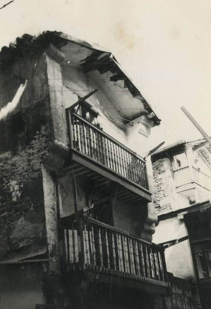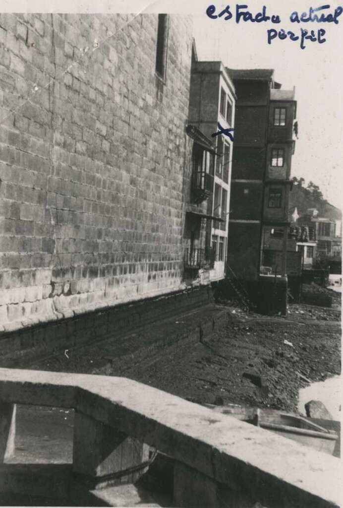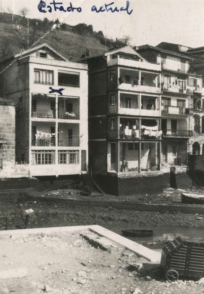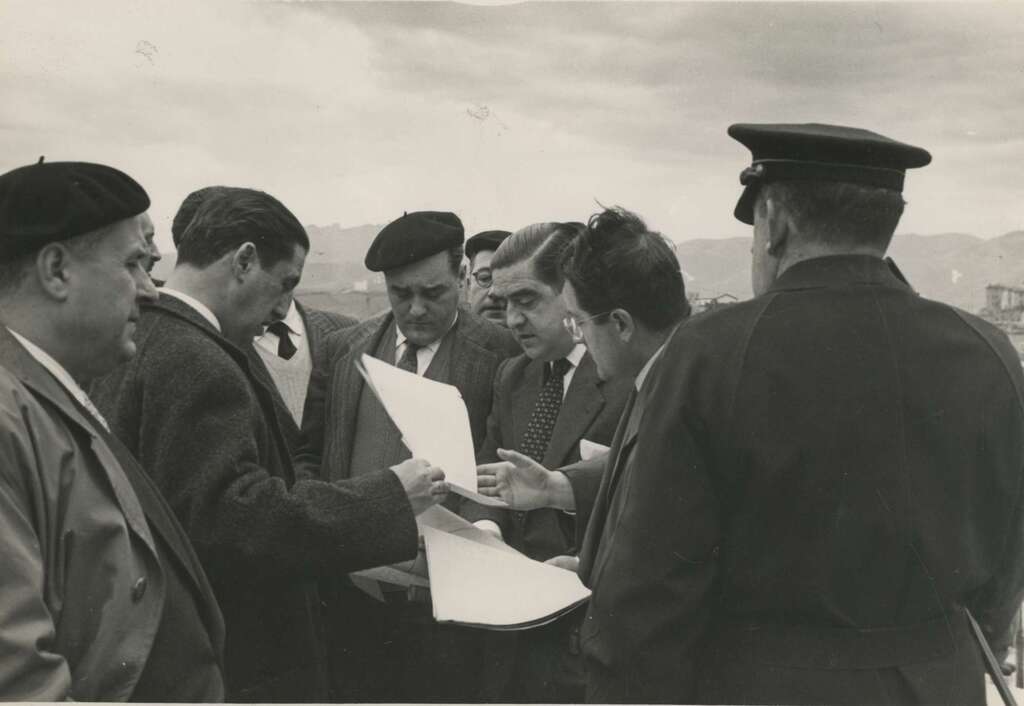 Barrio de Andonegi de Trintxerpe. En primer término, la iglesia y escuelas del Virgen del Carmen, campo de fútbol y el frontón. Al fondo, Bidebieta