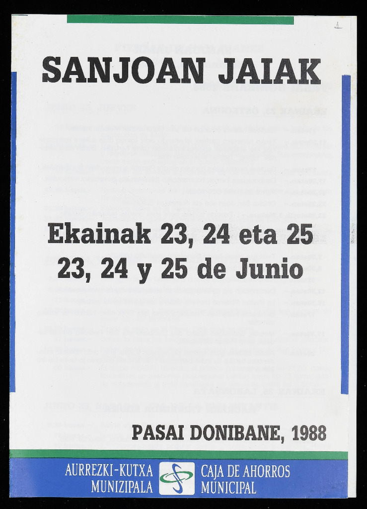 1988ko Pasai Donibaneko jaien egitaraua. Santiago, San Juan eta San Inazio.