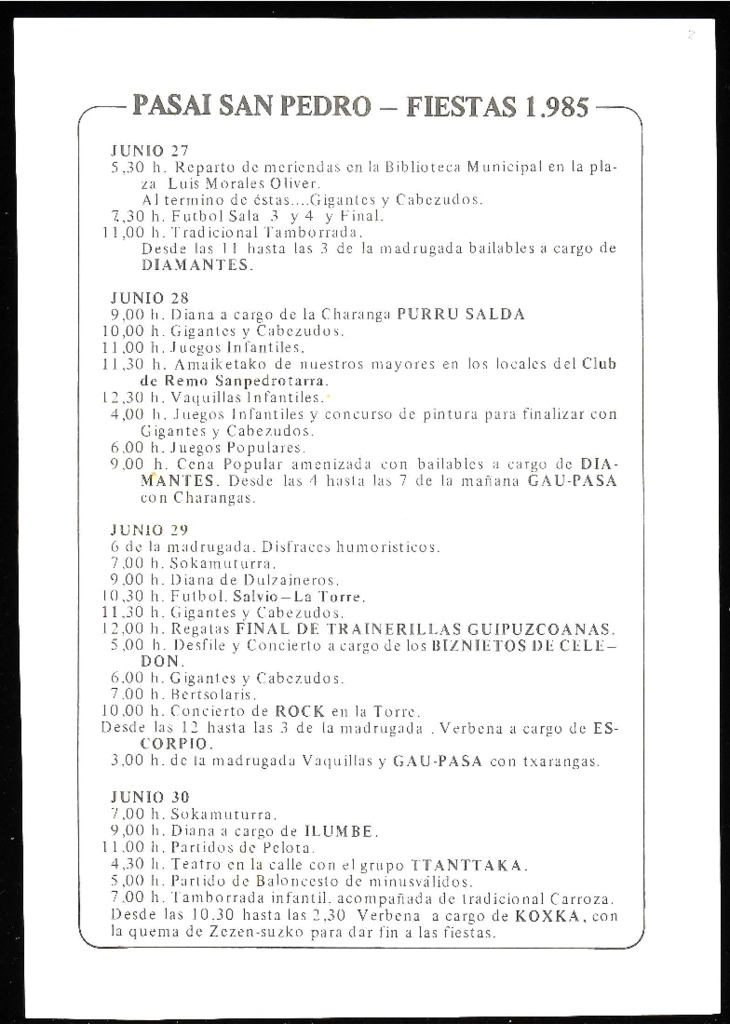 1985ko Pasai Donibaneko jaien egitaraua. Santiago, San Juan eta San Inazio.