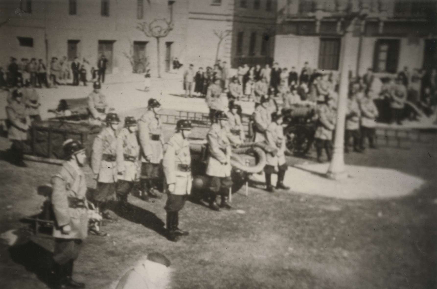 Cuerpo de bomberos posando junto a sus carros en la plaza