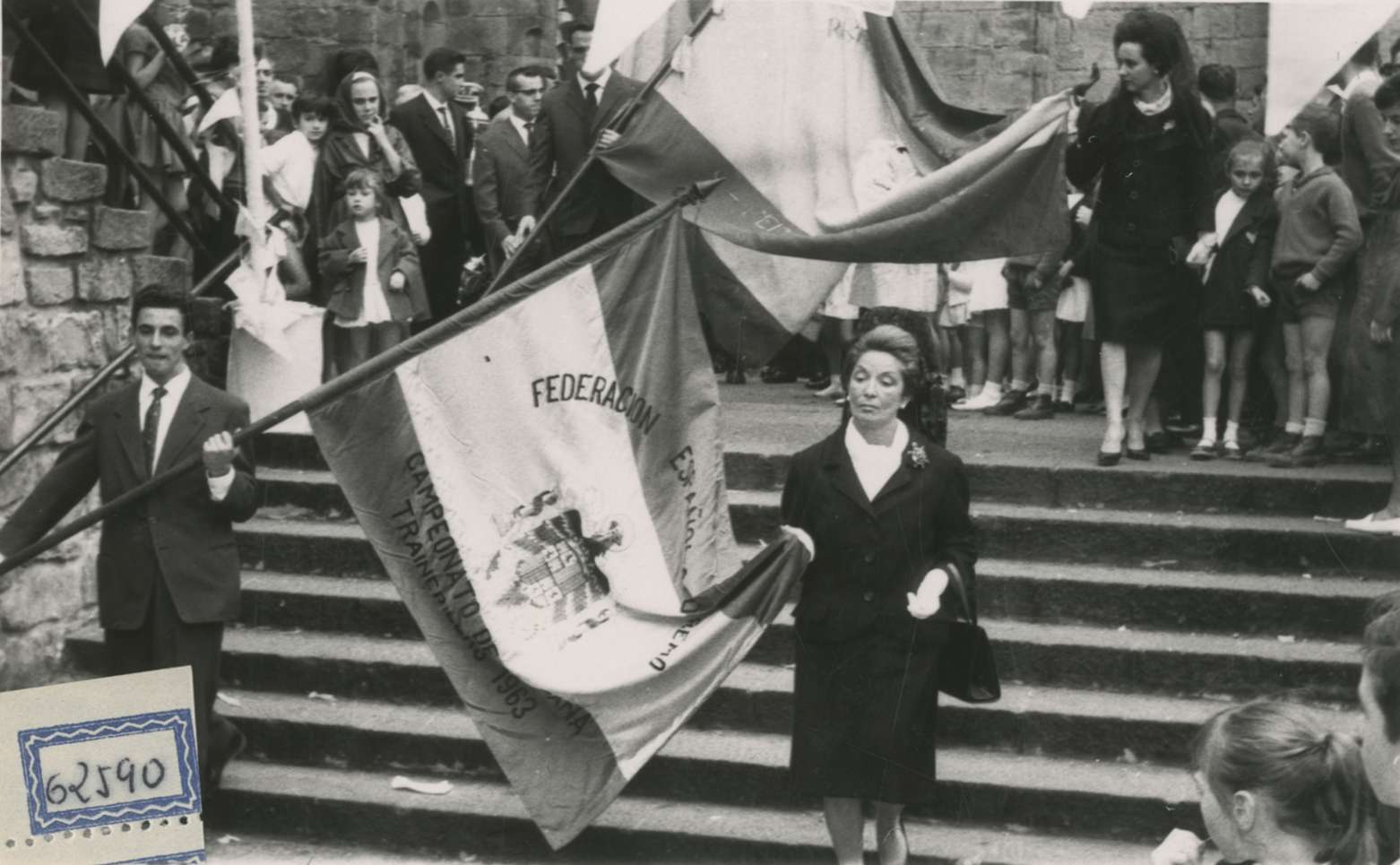 Desfile de las banderas hacia el Ayuntamiento. Al fondo se ve la entrada a la iglesia de San Juan Bautista