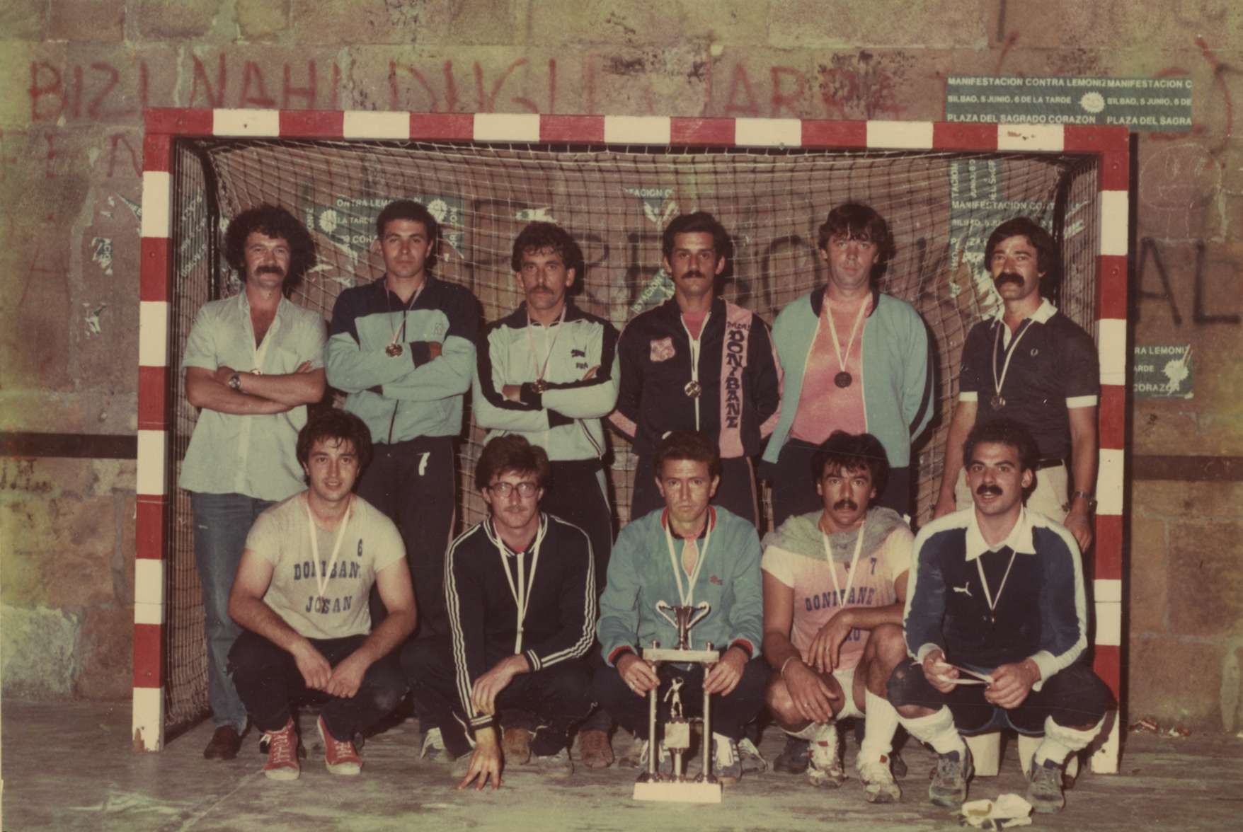 Futbito. Equipo Gin-Tos-O. Campeones de 1982. De pie, de izquierda a derecha, Txarli, Maklau, Etxabe, Ferrol, Txintxo, Gual. Agachados, de izquierda a derecha, Rodiño, Félix, Xalba, Pedro, Pazos