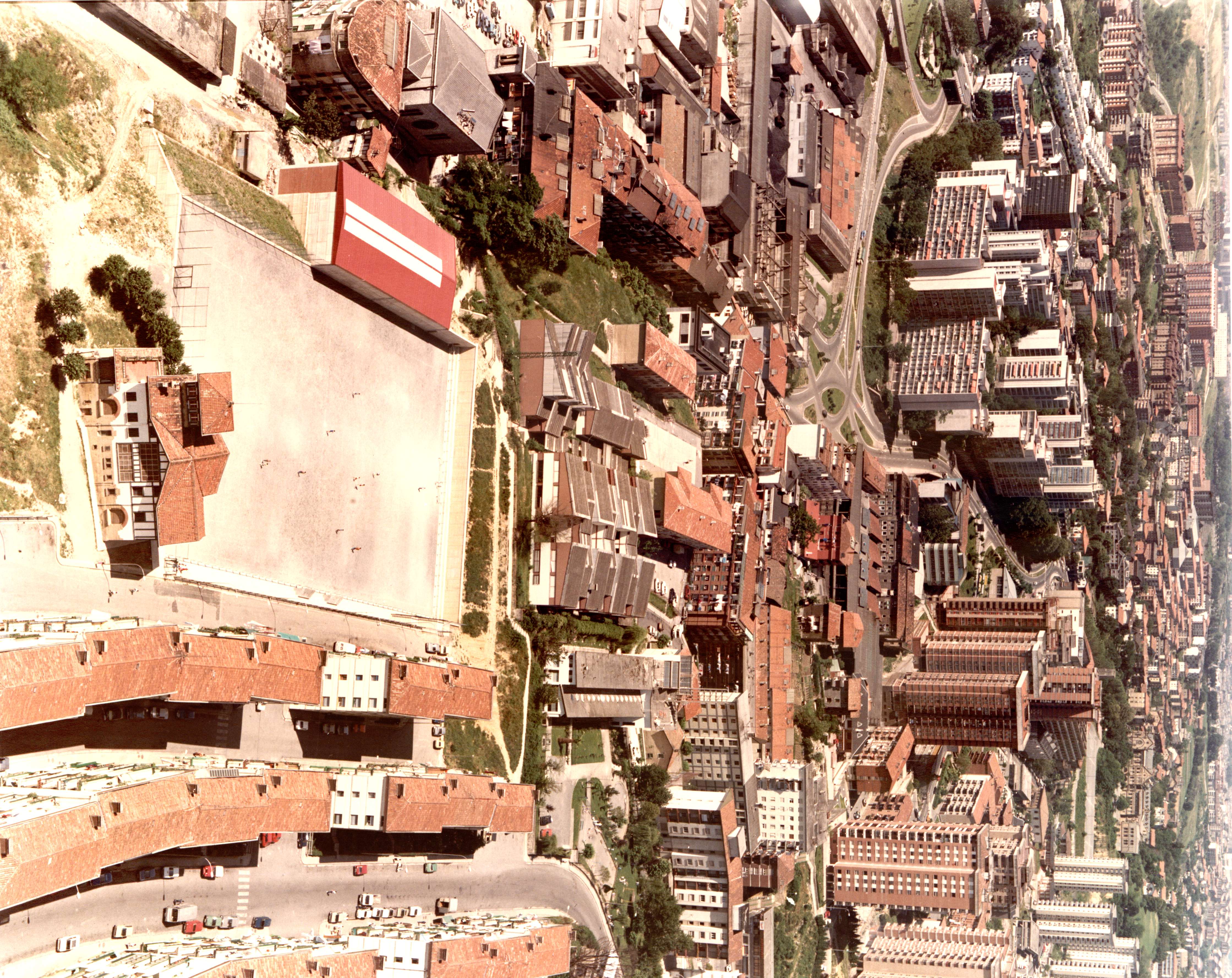 Barrio de Andonegi de Trintxerpe. En primer término, la iglesia y escuelas del Virgen del Carmen, campo de fútbol y el frontón. Al fondo, Bidebieta