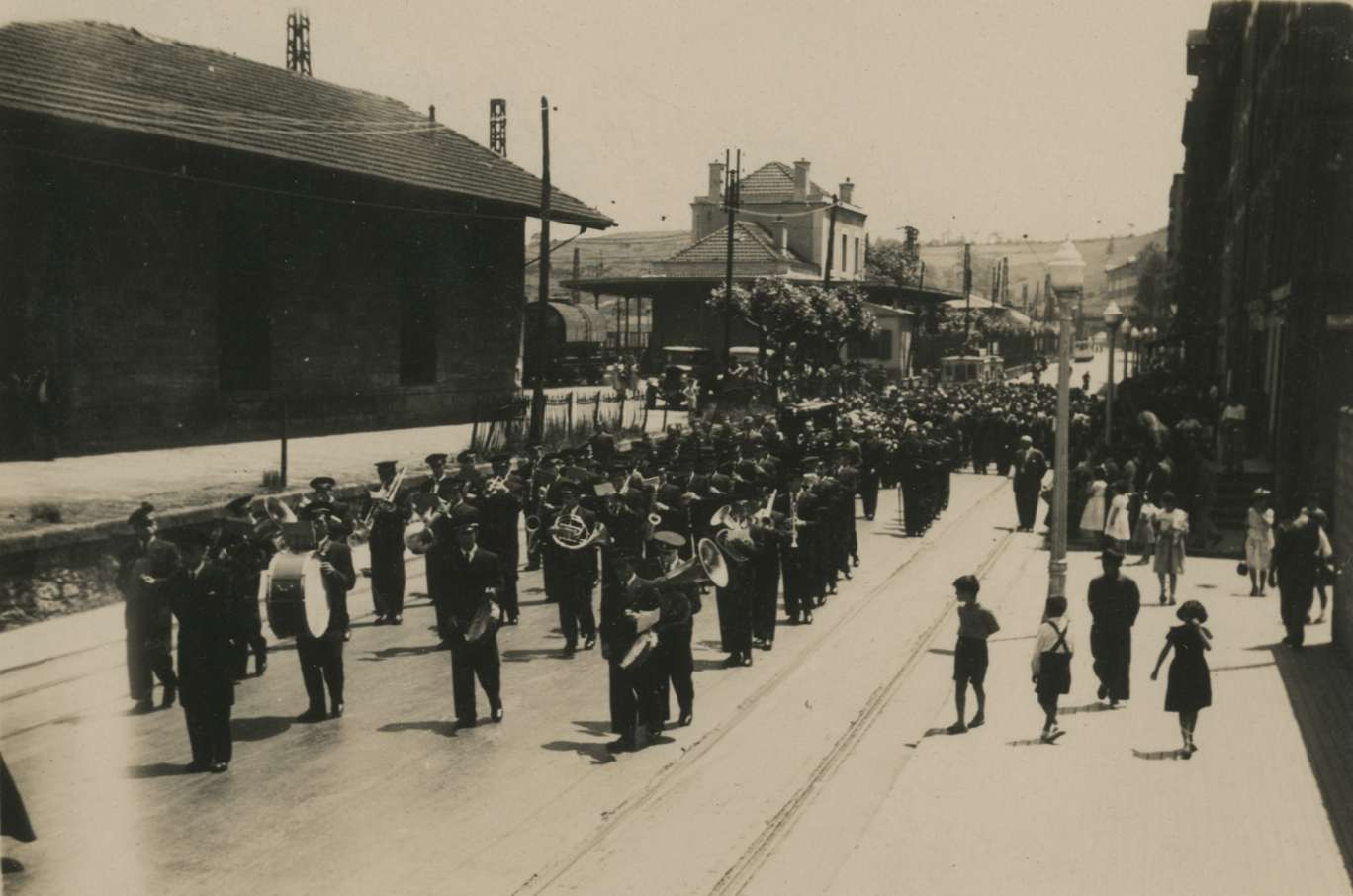 La banda de música frente al cortejo fúnebre por la avenida de Navarra