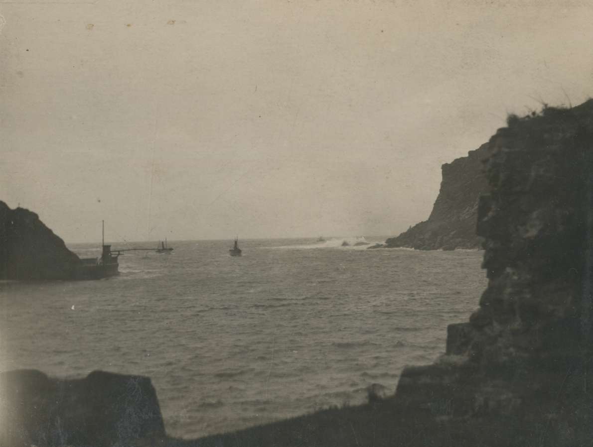 Barco entrando por la bocana de la bahía de Pasaia entre las rocas de Arando Txiki y Arando Aundi