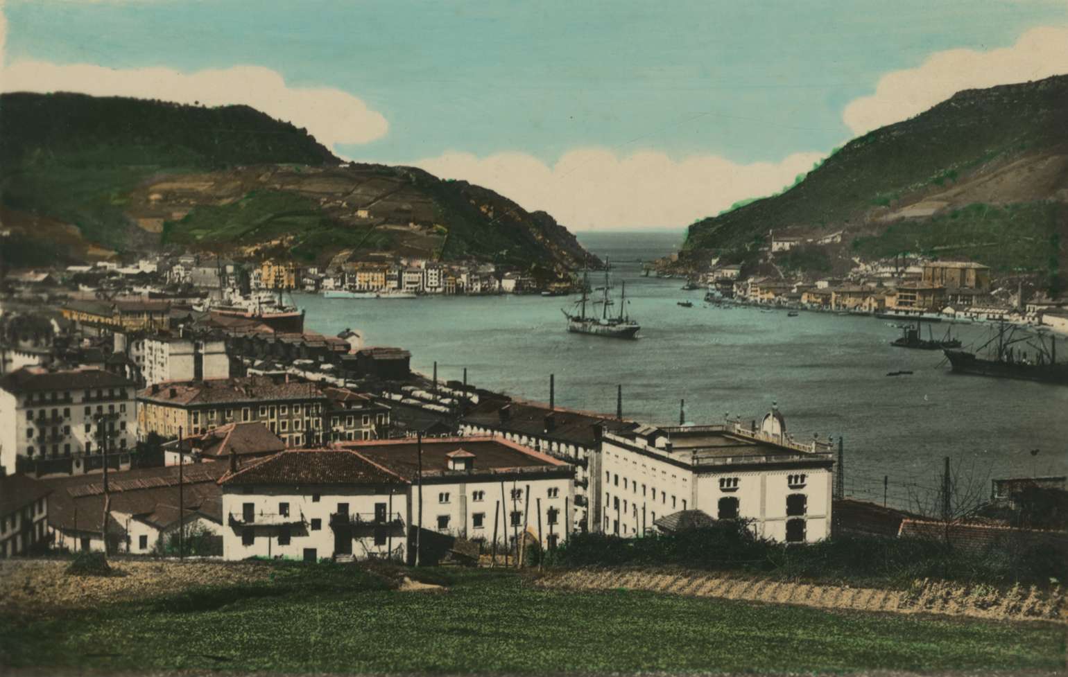 Texto en la parte trasera: "Pasajes: Vista General del Puerto" | Distrito: Pasai Antxo, Pasai Donibane y Pasai San Pedro | Postal coloreada