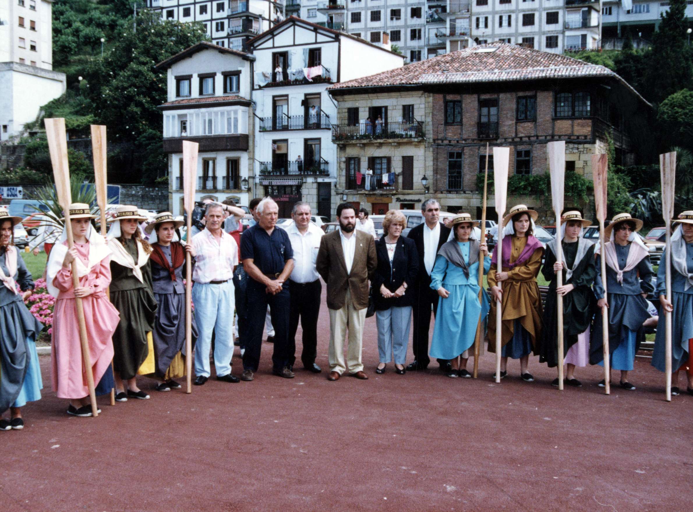 Ver programa y acta firmada en signatura: 844-6 | Distrito: Pasai Donibane | Información adicional: De izquierda a derecha: 1. ¿?; 2. José Luis Ugarte; 3. ¿?; 4. Xabier Portugal, alcalde; 5. Marivi Roteta y 6. Josetxo Domínguez, Concejal de Deportes. Al fondo se ve desde c/ San Juan, 16 a 22.